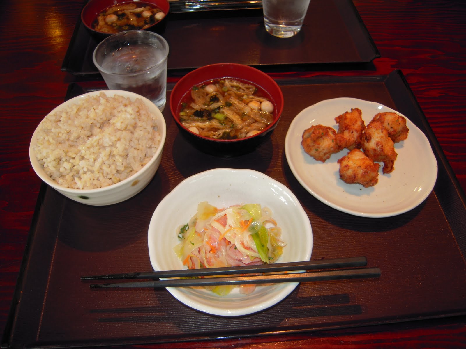 ご飯は玄米、味噌汁、唐揚げ、海老のマリネ。