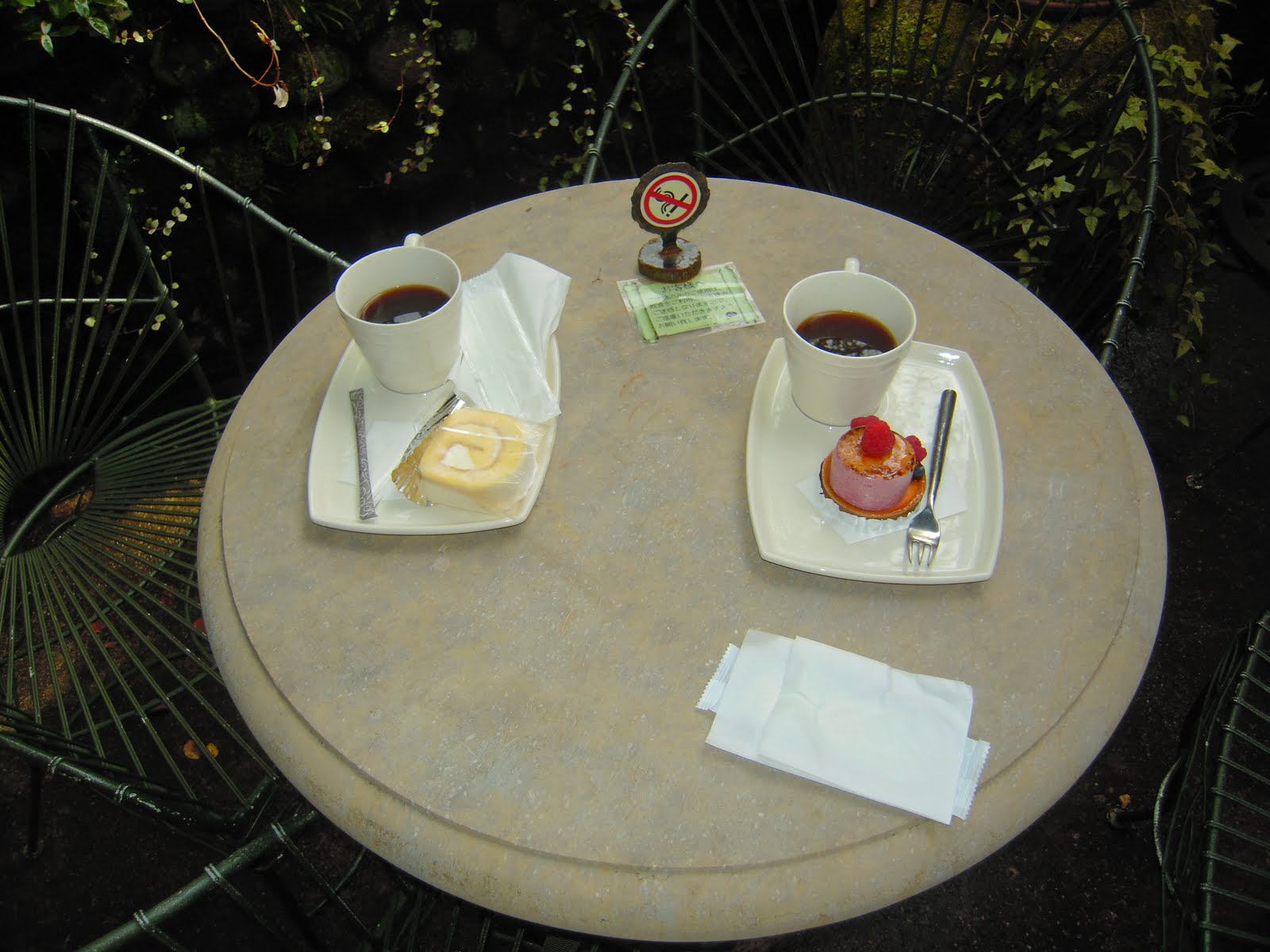 お菓子の森にある中庭カフェでケーキとコーヒーを頂いた。